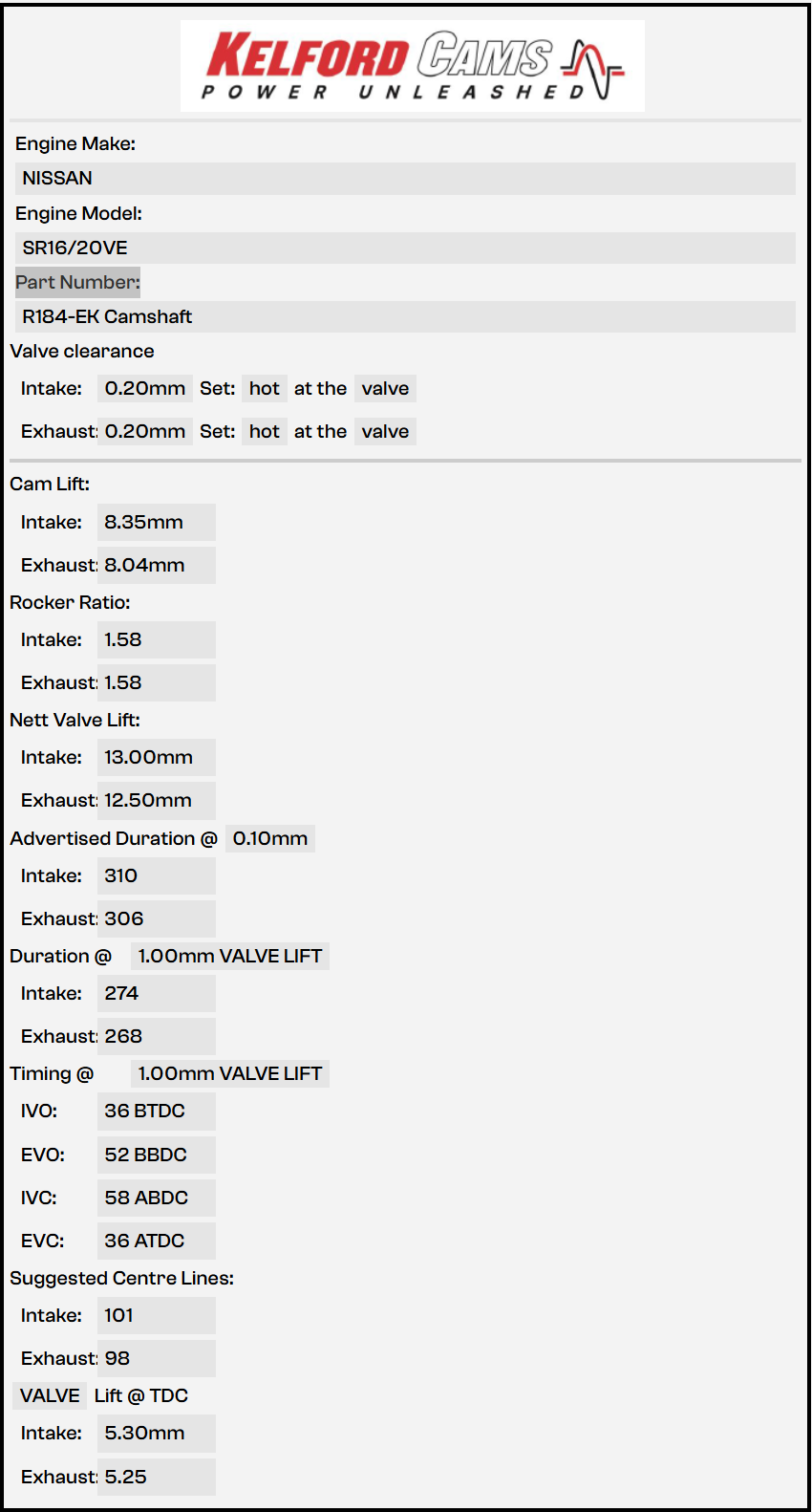 Naturally aspirated track and drag racing cams to suit professionally built engines running on race fuel. Great with stroker kits and ITB intake. Ideal in a lightweight car with close ratio gears. Not for street cars. Cams will pull to 10k+ rpm. Lobe profiles designed to suit the MT Performance roller rocker conversion. Kelford Cams recommend KVS10-BT-R valve spring kit.
